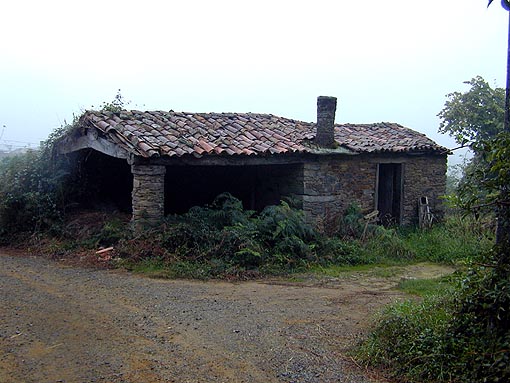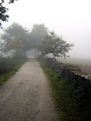 In der Nacht hatte es noch in Strömen gegossen. Gegen Morgen klarte es auf, die Luft war aber noch dunstig und feuchtigkeitsgeschwängert. Das erste Bild machte ich kurz nach halb neun, eineinhalb Stunden nach meinem Aufbruch aus dem am Nachmittag und Abend noch sonnigen Arzúa. In der morgendlichen Dunkelheit, auf einem schon am Tage düsteren Waldweg, wo man ohne Lampe die sprichwörtliche Hand vor Augen nicht sah, traf ich auf zwei Franzosen, die mich vorsorglich schon von weit her anriefen, als sie den schwankenden Schein meiner Taschenlampe wahrnahmen. Der Glühfaden ihrer Lampe war durchgebrannt und sie freuten sich sehr über mein Kommen. Der ältere der beiden hatte den camino francés schon einige Male solo geschafft, wie er mir auf englisch erzählte - mein karges Französisch brauchte ich also nicht zu bemühen, es ist verdrängt von der mir angenehmeren spanischen Sprache, die ich auch für meine parientes in Oaxaca, México lerne, weil sie mir nicht mehr in englisch schreiben wollen. Als es dann hell wurde, ein trüber Morgen, verabschiedeten sich die beiden mit Dankesworten, sie wollten noch möglichst weit kommen auf dieser Strecke - mein Hinkebein mußte erst wieder eingelaufen werden, es ging noch nicht so schnell. Lahm, wie ich war, erzielte ich kaum das im Dumont angegebene Durchschnittstempo, welches ich ohne die Schmerzen im Knie immer überboten hatte. Auch machte sich die elastische Binde immer mal wieder selbständig, so gut wie beim ersten Anlegen auf der Etappe am Vortag - mit Klebestreifen, weil ich die Sicherheitsnadeln nicht finden konnte, schaffte ich es nie wieder.